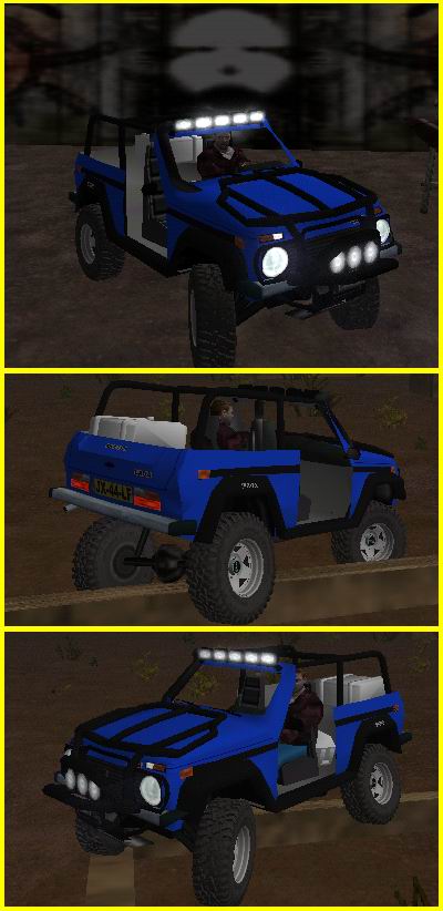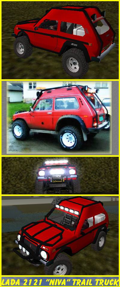 This is very realistic vehicle. Made from this photo :). For this it is 2 Trail Trucks. They are common. Lada 2121 "Niva" Trail Truck & Lada 2121 "Niva" Trail Truck 2. 2nd version is more powerful, can climb on rocks & has a removeable hood.